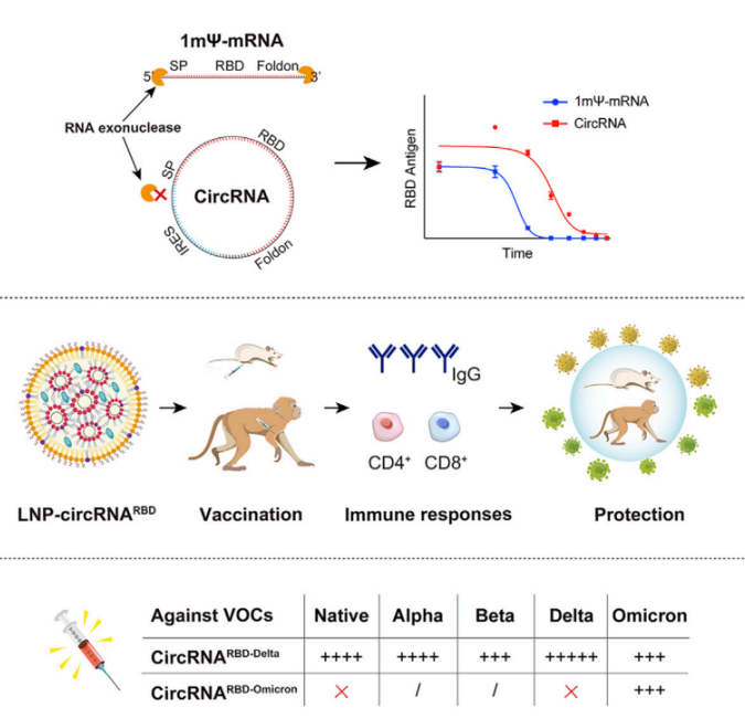 表达SARS-CoV-2 S蛋白的三聚体RBD的circRNA疫苗,诱导有效的中和抗体和T细胞免疫反应,在小鼠和恒河猴中提供针对变种SARS-CoV-2的强大保护。[17]