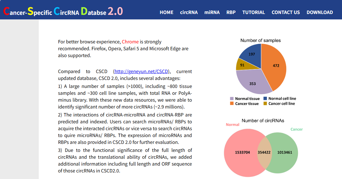 特点与适用场景:专注于肿瘤特异性circRNA,收录逾100万个癌症相关靶点。提供miRNA/RBP结合位点及开放阅读框(ORF)预测,可用于癌症机制研究中的靶点精确筛选与翻译潜能分析。