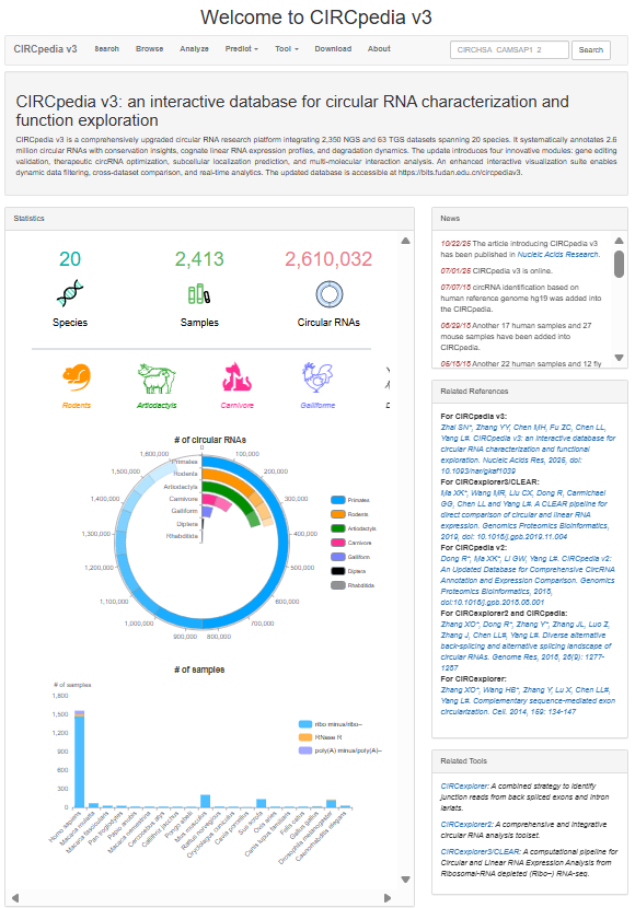 数据覆盖与更新:v3版本扩展至20个物种,整合2000余个测序样本并注释约260万个circRNA(原中科院旧网址已停用)。