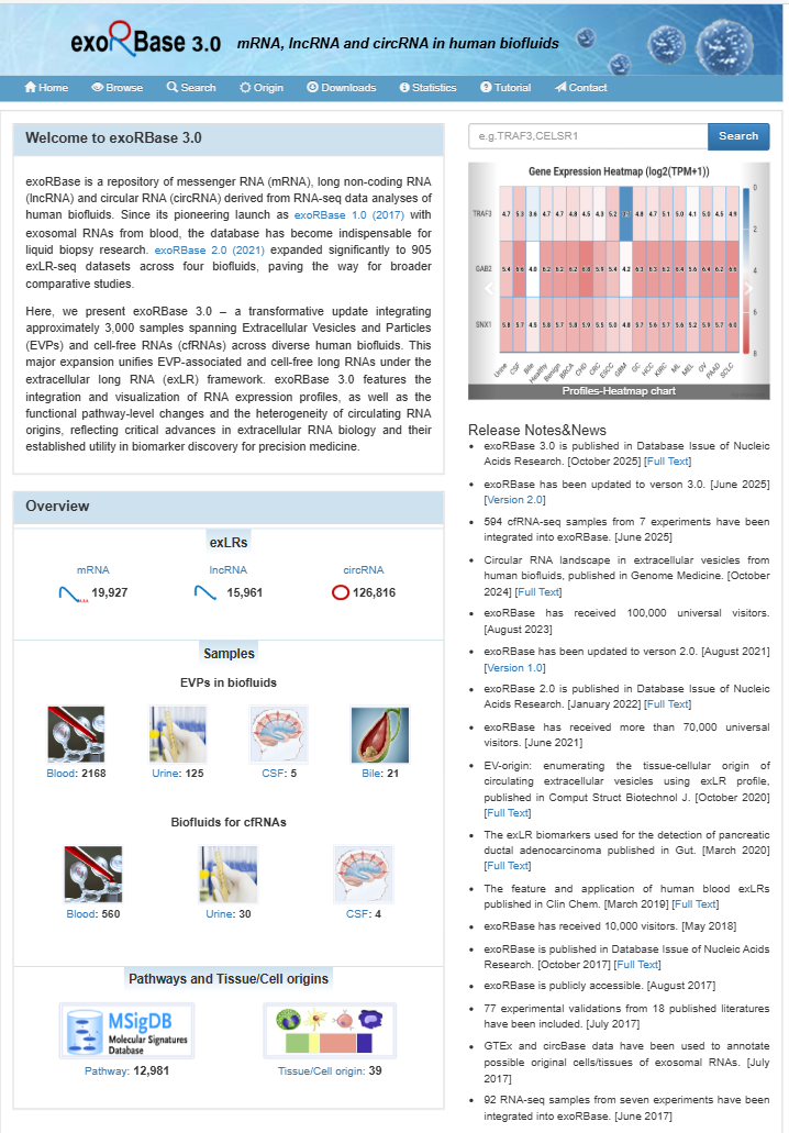 特点与适用场景:专注于人类血液等体液外泌体中的RNA表达图谱,整合了正常人与各类疾病患者的测序数据。适用于筛选和开发体液circRNA无创诊断标志物。